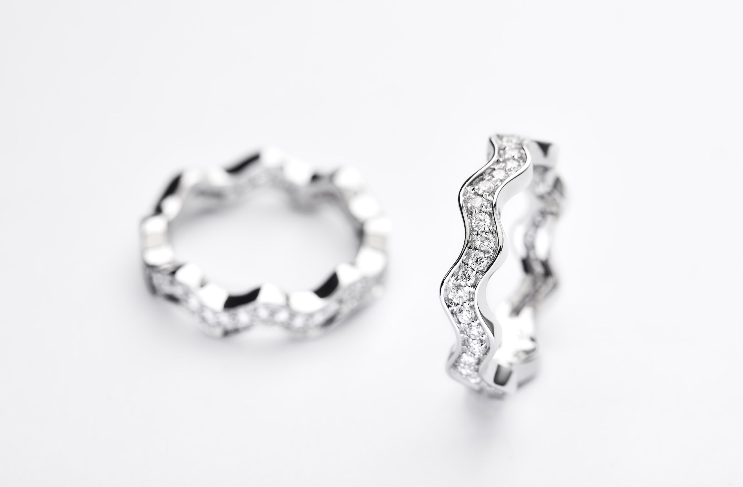 Connect portrays refined designs and textures that bring to life unique pieces full of personality and perfectly balanced contrasts: thus the satin-finish that opposes the glossy intertwining, into another creation, with a pavé of white diamonds.